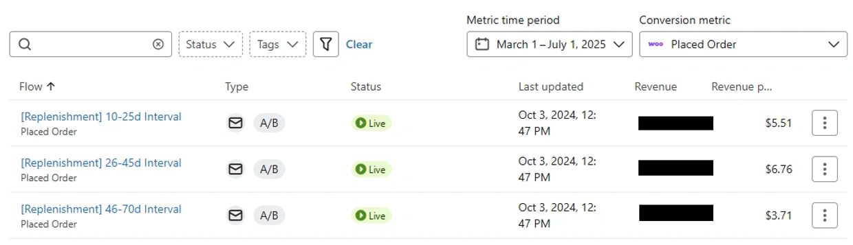 I created a tiered replenishment flow, powered by real-time data from WooCommerce and Klaviyo.